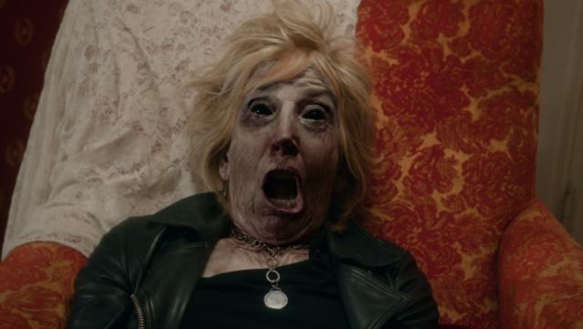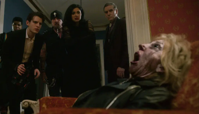 The color and lighting strategy is equally thoughtful. With the wood providing a dark but warm canvas, the team focuses on lighting faces and preserving clarity rather than plunging everything into murk. Costumes do a lot of character work with most of the ensemble in neutral or dark tones, while Felix’s more colorful wardrobe (with its ominous red accents) screams “do not trust this man.” Lin Shaye’s look is a highlight—Rachel Olsen and her makeup team evolve Max from a powerful boss to something much more grotesque and heightened, with cool gray tones playing spectacularly against a black leather jacket. Boyd has admitted they weren’t afraid to go a little “Evil Dead–absurd” with her later-stage makeup. The film is heightened and satirical, and the design embraces that.